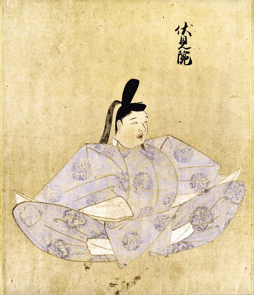 Een portret, toegeschreven aan Fujiwara no Tamenobu 藤原為信 (1248-?), van ‘Teruggetreden Vorst Fushimi’ 伏見院 (1265-1317), in Portretten van vorsten en regenten (Tenshi sekkan miei 天子摂関御影), een laat-dertiende- en vroeg-veertiende-eeuwse rolschildering met 131 (uiteraard goeddeels fictieve) portretten van vorsten en hoge hovelingen uit de Heian- en Kamakura-perioden (794-1333), die in 1878 aan het keizershuis werd geschonken. Bron: Wikipedia.