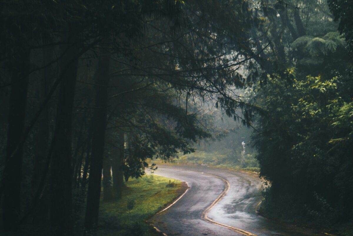 Chieko’s zomerkimono verdwijnt tussen pijnbomen om dan weer op te duiken
