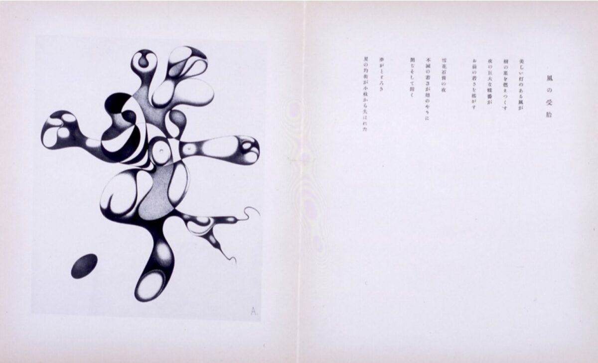 De afbeelding toont het gedicht van Takiguchi Shūzō 瀧口修造 (1903-1979) met illustratie door Abe Yoshibumi 阿部芳文 (aka Nobuya 展也, 1913-1971) in Yōsei no kyori 妖精の距離 (De afstand van feeën, 1937).