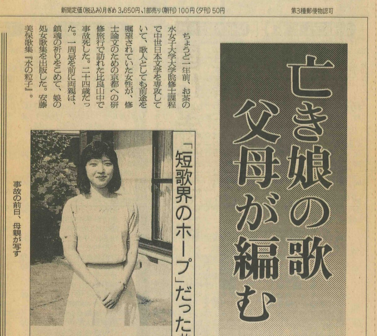 Het gaat hier om de dood en de postuum uitgegeven poëzie van Andō Miho 安藤美保 (1967-1991), eeuwig 24 jaar oud. Haar licht bizarre manier van overlijden zal ook wel een rol gespeeld hebben.